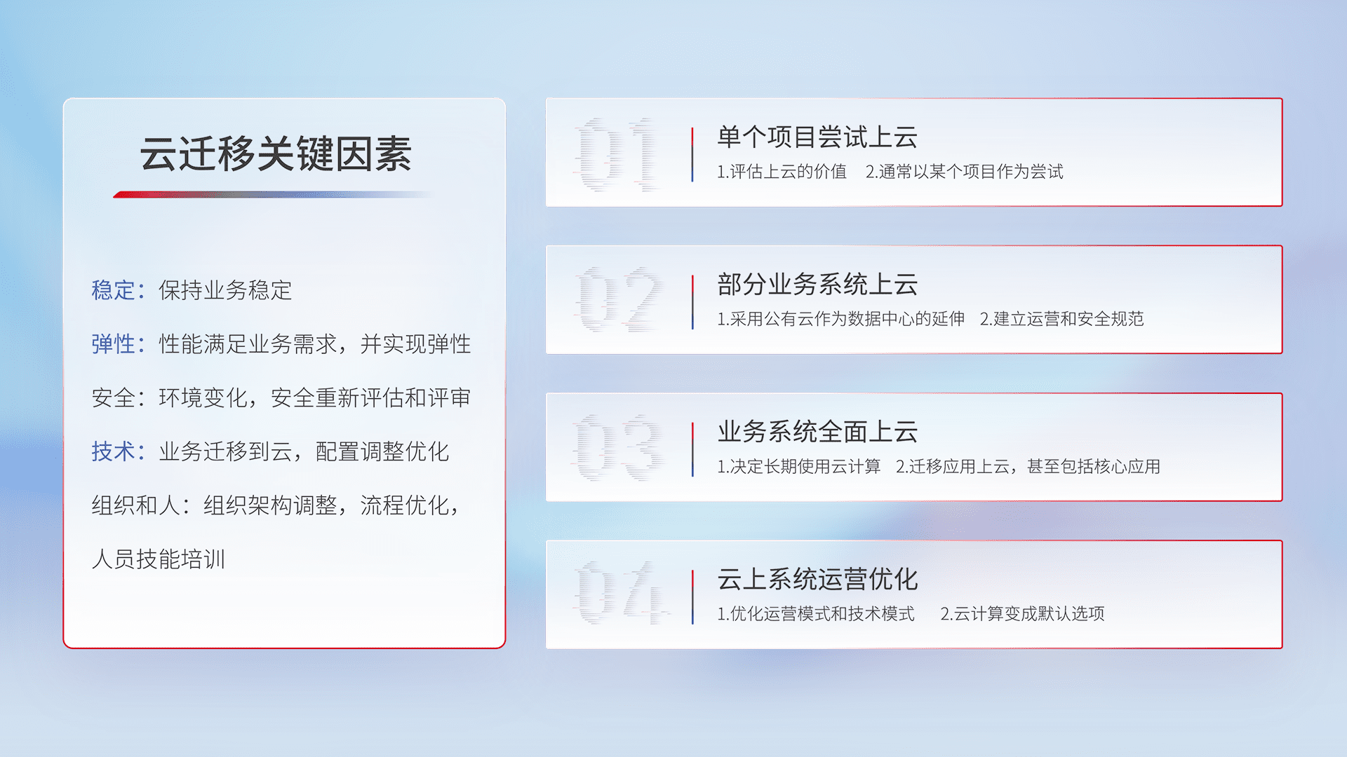 结合实际业务,,,,从规划设计、、、云平台选型、、、云原生改造、、数据迁移、、、、集成交付,,迁移全过程为客户识别最佳上云路径,,,做好风险识别管理,,,,设计网络架构、、、、身份权限、、、、安全审计合规、、、操作审计、、日志审计、、监控告警策略、、、多站点容灾设计等,,,对云上基础设施进行整体规划,,提升IT治理水平,,,,以满足弹性、、高可用、、、高性能的需求。。。